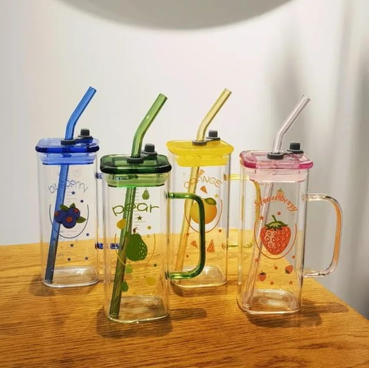 Random Printed Color 400ml Square Glass Mug With Handle, Straw & Lid, Drinking Glass